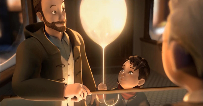 小男孩在爸爸的陪同下購(gòu)買了一個(gè)神奇的金色氣球,戳破氣球就能變出一個(gè)巨大的熒幕,人們可以通過(guò)這種氣球來(lái)觀看電影。